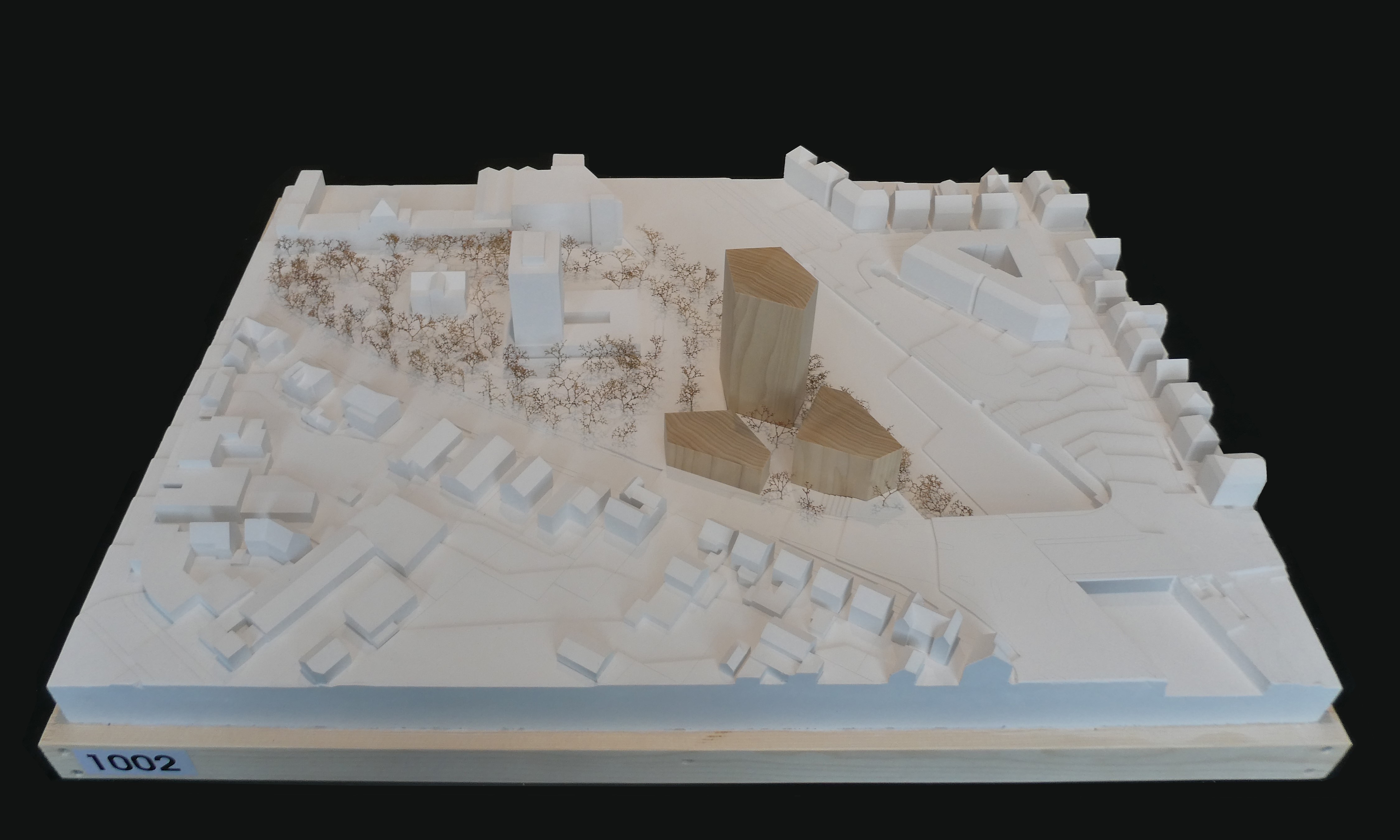 Die ersten Preisträger*innen haben die Aufgabe wie folgt gelöst: Sie planen drei Gebäude, die zusammen einen großen, von Bahn- und Straßenlärm abgeschirmten Quartiershof bilden. Das vierzehnstöckige, etwa sechzig Meter hohe Hochhaus zeigt mit seiner Schmalseite in Richtung Bahnhof. An das Hochhaus schließt sich direkt an den Gleisen ein drei- bis viergeschossiger Bau an. Dazu kommt ein L-förmiges, viergeschossiges Hotel an der Keplerstraße. Alle drei Gebäude sind im gleichen Grünton gehalten und die Fassaden zurückhaltend gestaltet, was den Ensemble-Charakter betont. Die Gebäude sind in Holzhybridweise geplant. Für alle Materialien wird ein Cradle-2-Cradle-Ansatz verfolgt. Auf den Dachflächen sowie den Südfassaden der Gebäude sind hocheffiziente Photovoltaik-Paneele vorgesehen