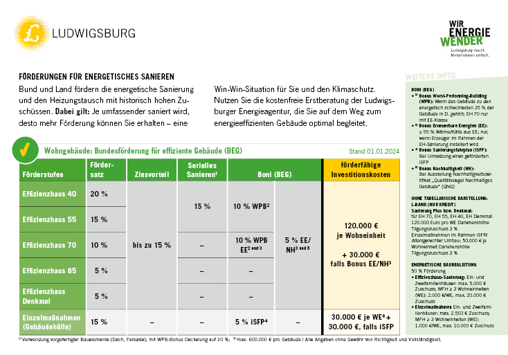 Bitte beachten Sie: Förderantrage müssen in der Regel vor der Auftragsvergabe gestellt. Gerne berät Sie die Energieagentur Kreis Ludwigsburg e.V., von welcher Förderung Sie profitieren können.