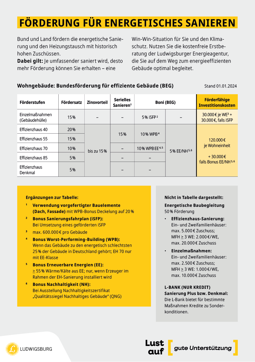 Da insbesondere ältere Gebäude unnötig viel Energie verbrauchen und CO2 ausstoßen, fördert der Staat energetische Sanierungen je nach Maßnahme mit bis zu 70 %. Darüber hinaus fördert die Stadt Ludwigsburg energetische Sanierungen und den Umstieg auf Erneuerbare Energien im Stadtgebiet mit dem lokalen KlimaBonus.