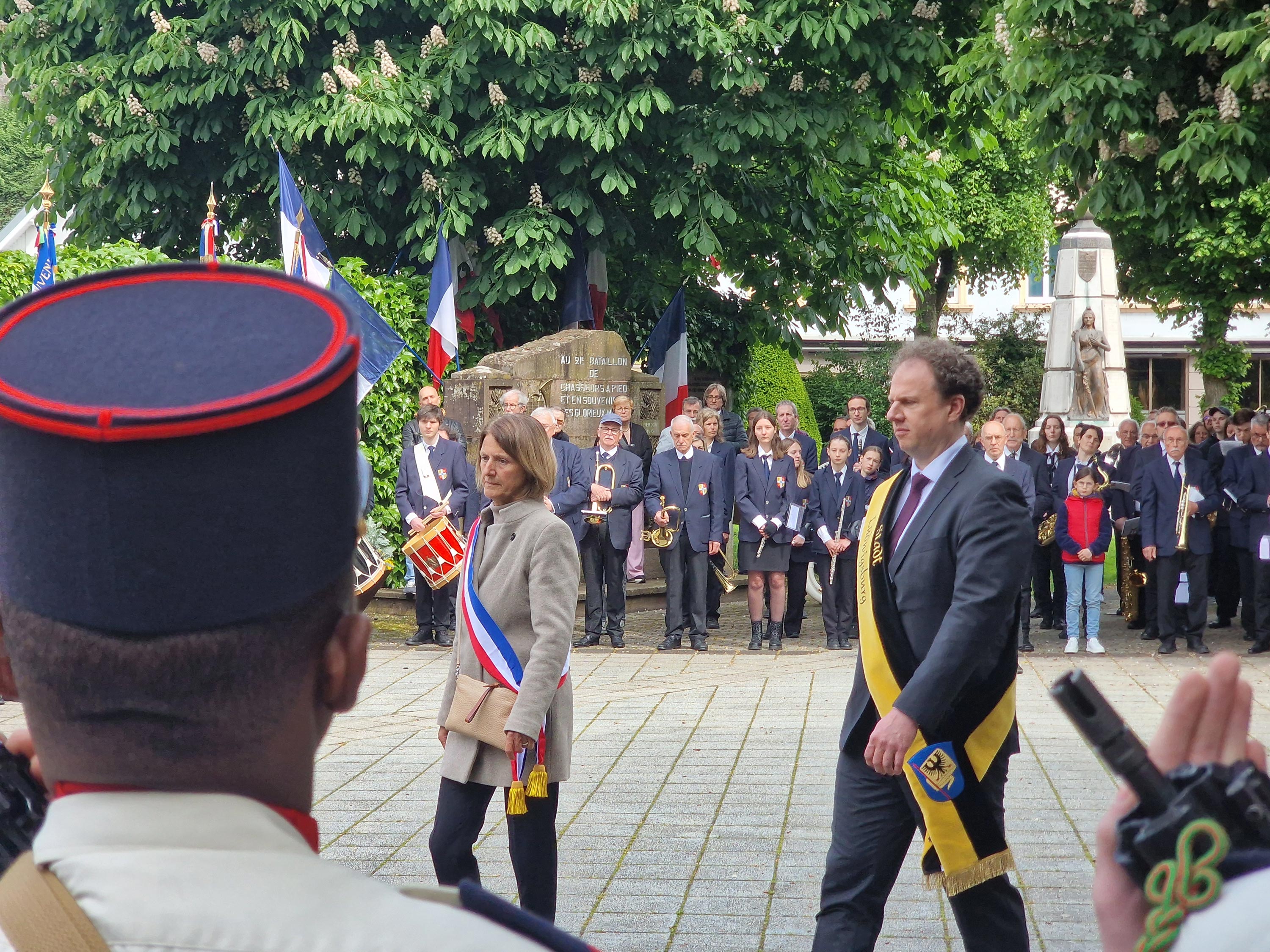 OB Dr. Knecht und Montbéliards Bürgermeisterin Biguinet gedachten am 8. Mai 2025 in Montbéliard gemeinsam dem 80. Jahrestag des Kriegsendes.