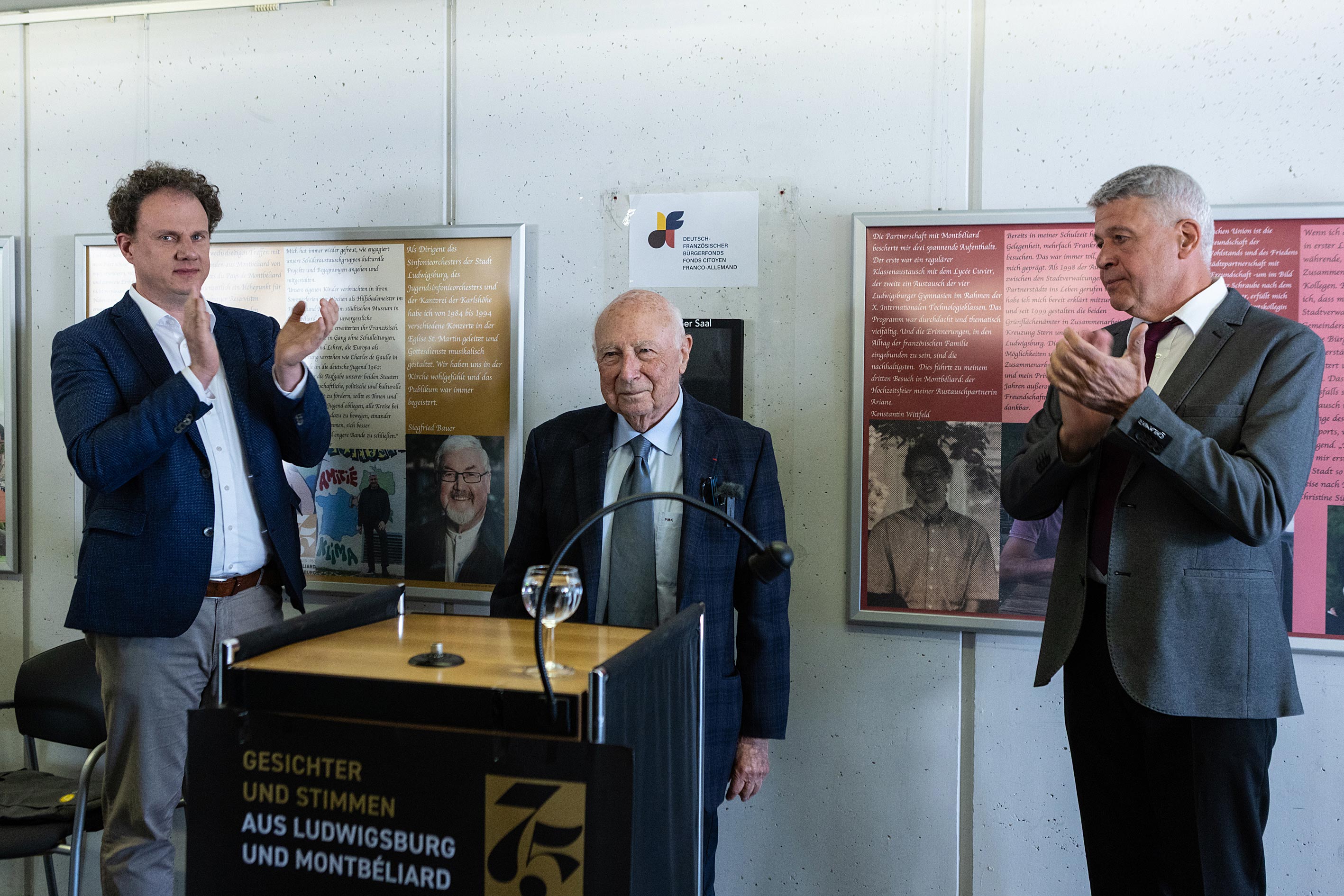 Der Holocaust-Überlebende Pierre-Michel Kahn besuchte Ludwigsburg und teilte seine Geschichte mit Besuchenden der Ausstellung "Gesichter und Stimmen aus Ludwigsburg und Montbéliard", organisiert vom Verein Internationale Partnerschaften Ludwigsburg e. V. Links im Bild OB Dr. Knecht, rechts Wolfgang Medinger, Vorstandsmitglied des Vereins.