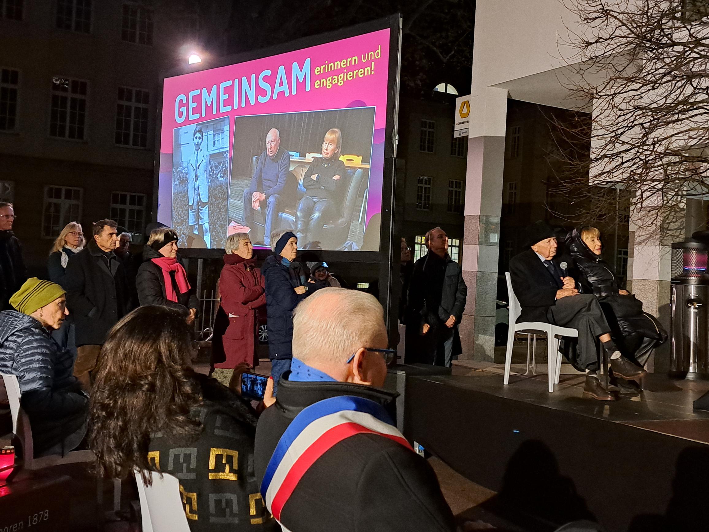 Am 10. November 2025 wurde auf dem Synagogenplatz der Reichsprogromnacht gedacht. In diesem Jahr war anlässlich des Jubiläums der Städtepartnerschaft auch eine Delegation aus Montbéliard dabei. Unter dem Titel "Gemeinsam Erinnern und Engagieren" gedachten die Gäste der Opfer der NS-Zeit. Es sprach u.a. Pierre Michel Kahn - der einzige Überlebende einer jüdischen Familie aus Montbéliard.