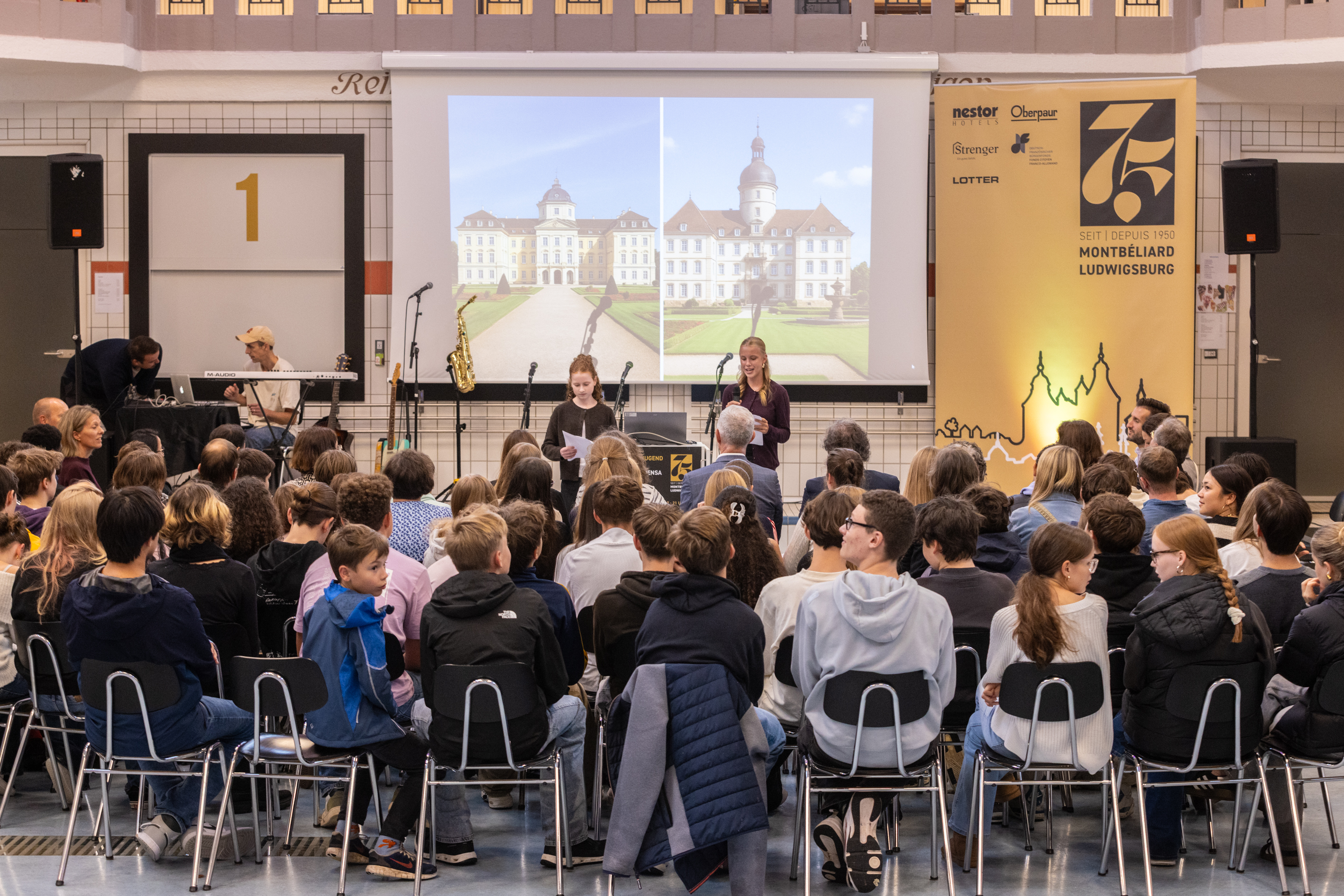 Im Rahmen der Jubiläumsfeierlichkeiten fand am Donnerstag, 25. September 2025, ein „Fest der Jugend“ in der Stadtbadmensa statt. Das Fest stand ganz im Zeichen der jungen Generation, denn seit jeher spielen Austausch und Begegnung zwischen Schülerinnen eine zentrale Rolle in der Städtepartnerschaft. Eine Austauschgruppe aus Montbéliard war hierfür nach Ludwigsburg gereist - gemeinsam mit den Schulleitungen und Lehrkräften des Collège Guynemer, des Lycée Cuvier und des Collège Jean-Jacques Rousseau. Die Jugendlichen präsentierten ein kreatives Programm, das die deutsch-französische Freundschaft auf lebendige Weise zum Ausdruck brachte. Im Anschluss wurde bei Disco Musik gemeinsam gefeiert - eine ideale Gelegenheit, neue Freundschaften zu knüpfen und die Verbundenheit zwischen den beiden Städten weiter zu stärken.