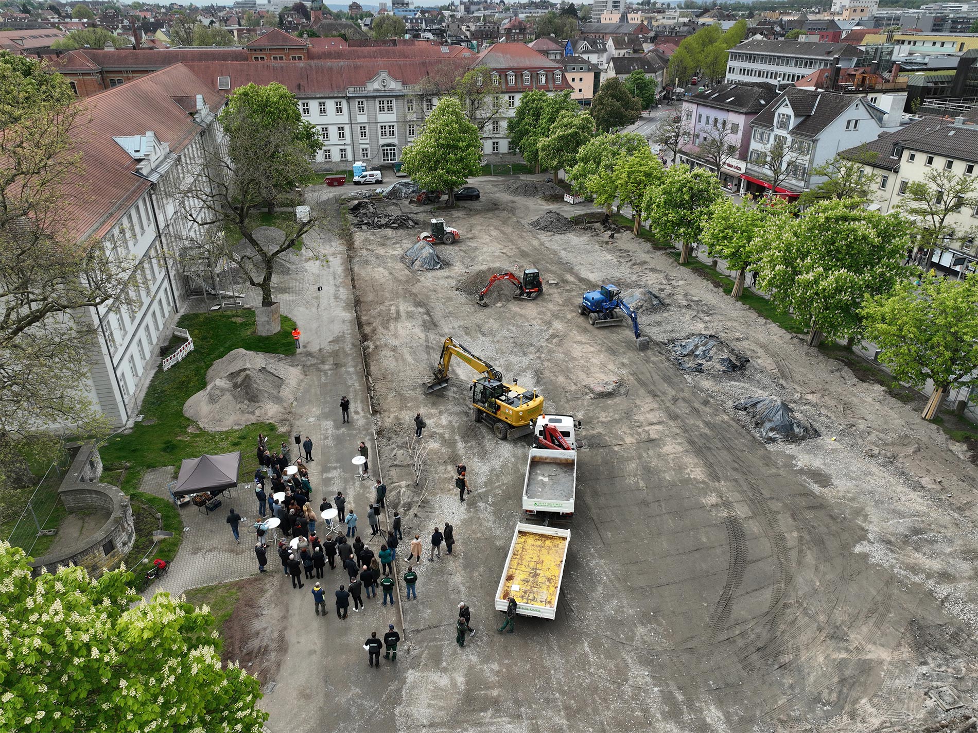 Baggerbiss auf dem Arsenalplatz Mit dem Baggerbiss durch Oberbürgermeister Dr. Matthias Knecht sind am 25. April die offiziellen Baumaßnahmen zur Umgestaltung des Arsenalplatzes gestartet. Der seitherige Parkplatz wird zu einer grünen Oase umgebaut.