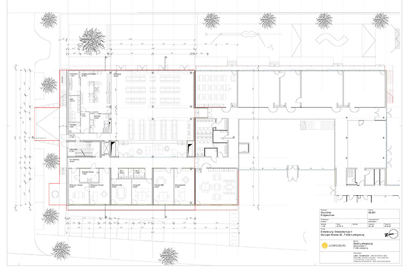 Der erste Bauabschnitt der Oststadtschule (zweizügige Grundschule mit Erweiterungspotential) wurde im Juni 2001 in Betrieb genommen. Nach den aktuellen Prognosen werden zukünftig deutlich mehr Schüler die Oststadtschule besuchen. Mit dem Anstieg der Schülerzahlen wird es auch zu einer Steigerung der zu betreuenden Kinder im Rahmen der Schulkindbetreuung und ebenfalls zu einer Teilnahme am Mittagessen kommen. Nach dem Beschluss des Raumprogramms durch den Gemeinderat am 24.01.2018 wurde mit der Planung begonnen.