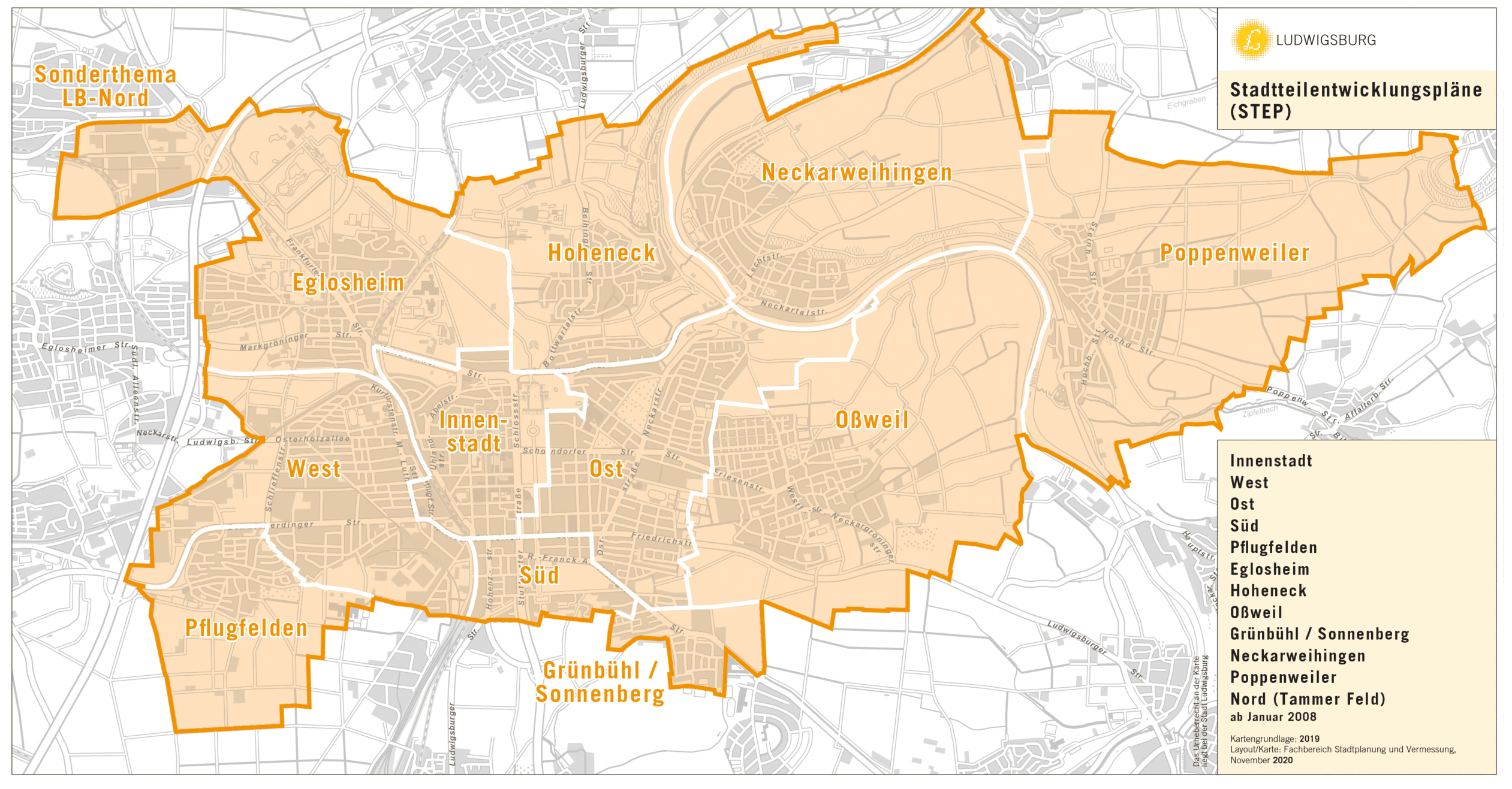 Neben der Innenstadt zählen die Oststadt, Südstadt, Weststadt, Grünbühl-Sonnenberg, Hoheneck, Neckarweihingen, Oßweil und Poppenweiler zu den 11 STEP-Gebieten in Ludwigsburg.