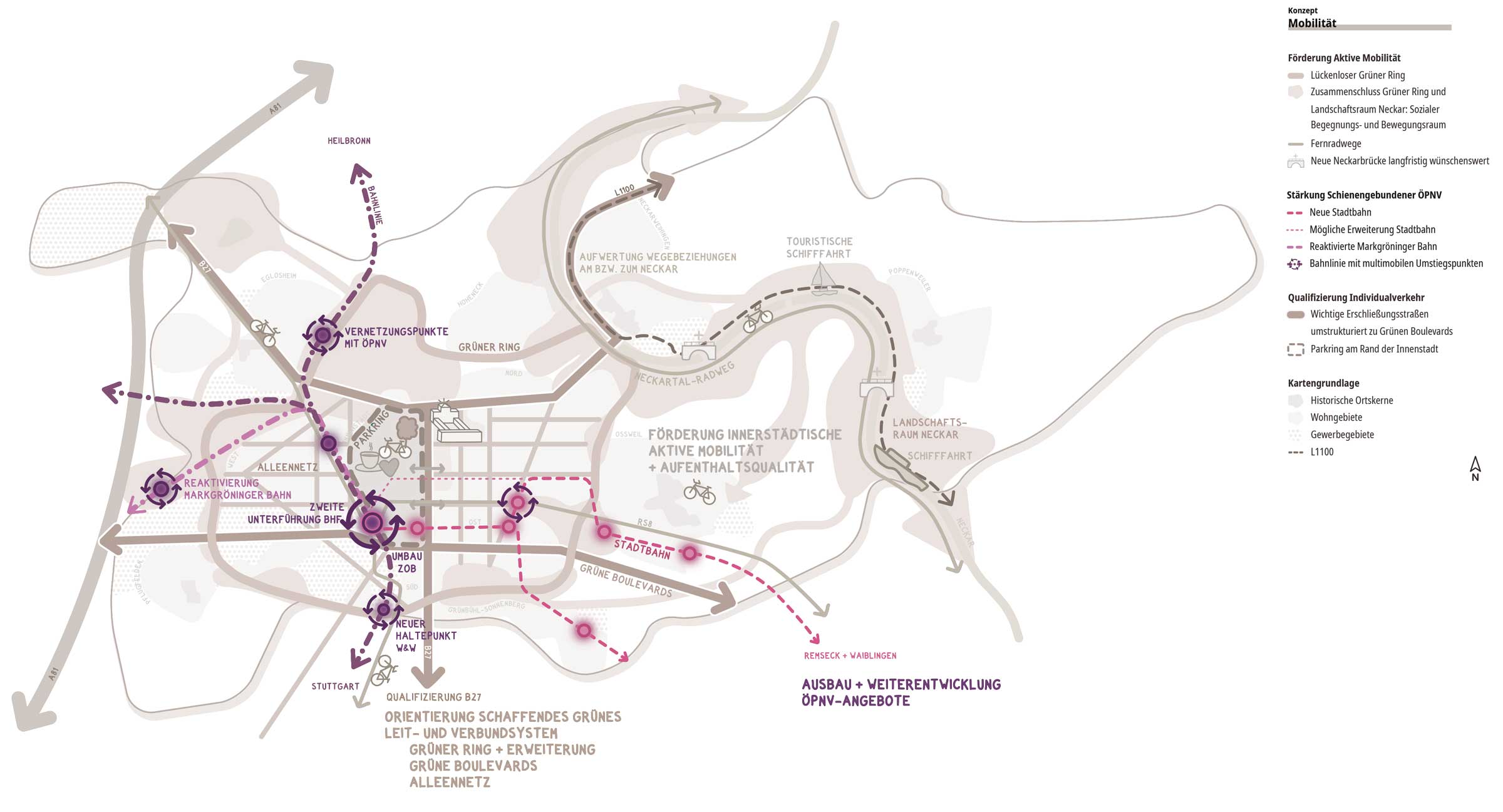 - Von besonderer Bedeutung ist der Ausbau und die Weiterentwicklung der ÖPNV-Angebote (zum Beispiel durch den Umbau ZOB, den Bau der zweiten Unterführung, den Bau Markgröninger Bahn etc.).