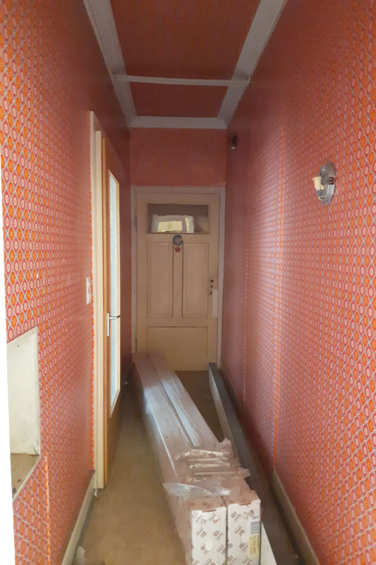 Die Wohnung im ersten Obergeschoss wurde zur Wiedervermietung nach aktuellem Standard saniert. Da in dem Gebäude kein separates Bad mit WC vorhanden war, wurde ein Bad mit WC und eine Küche eingebaut. Die vier Zimmer konnten beibehalten werden.