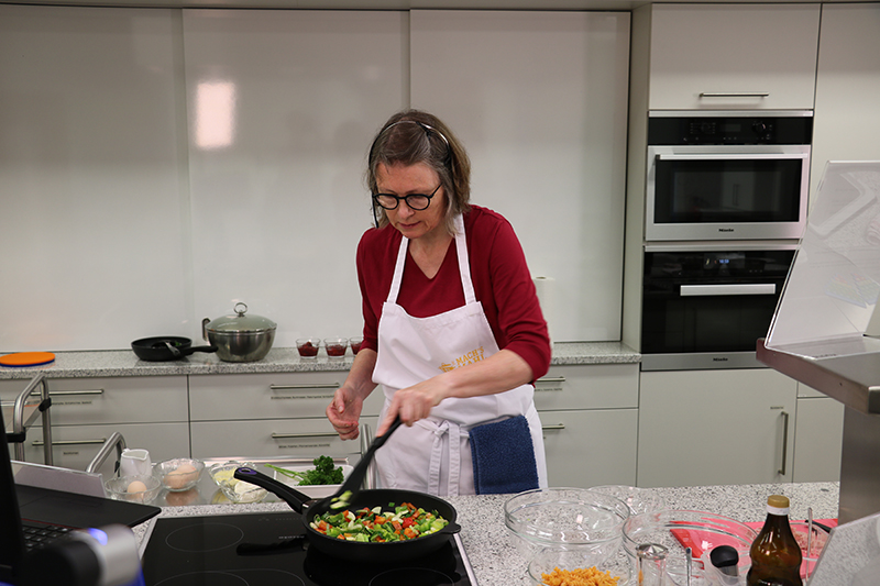 Hauswirtschaftsmeisterin Frau Martina Spalt-Kuhlmann kochte in der Lehrküche des Ernährungszentrums Mittlerer Neckar in Ludwigsburg und die Teilnehmer konnten zu Hause live mitkochen.