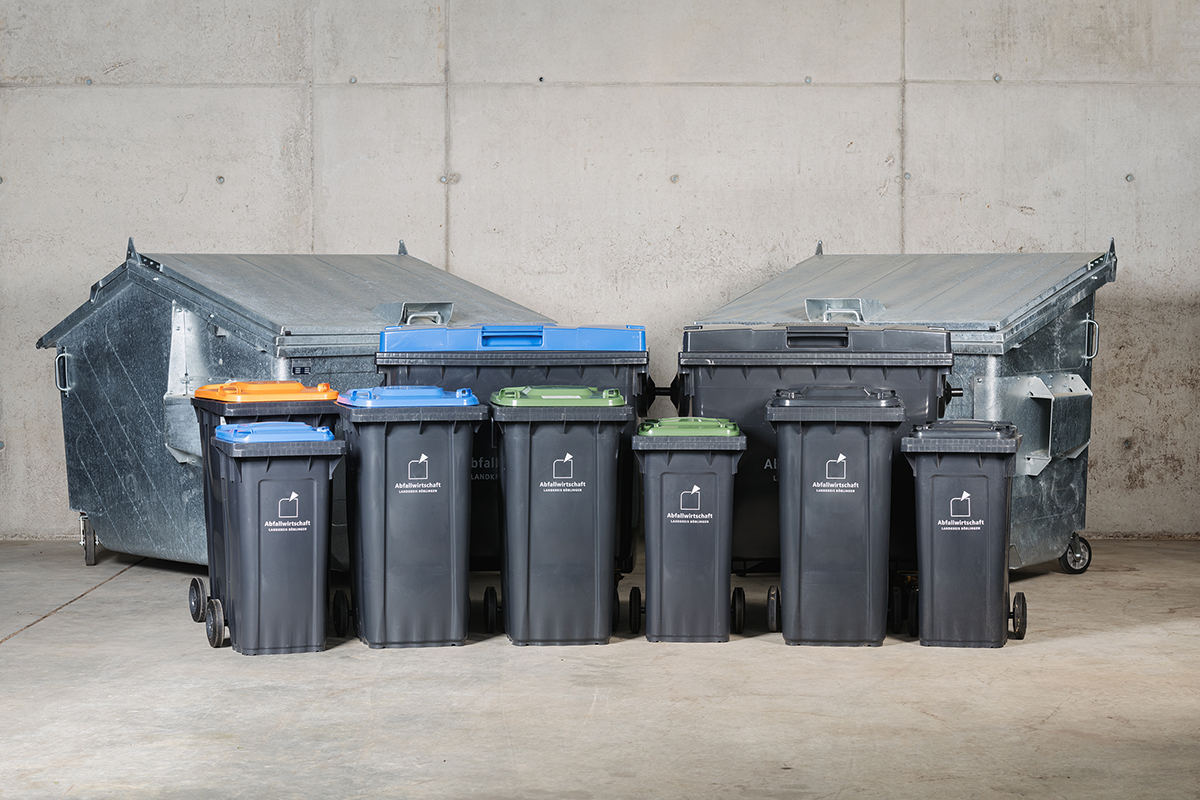 Restmüll-, Bio- und Wertstofftonnen
