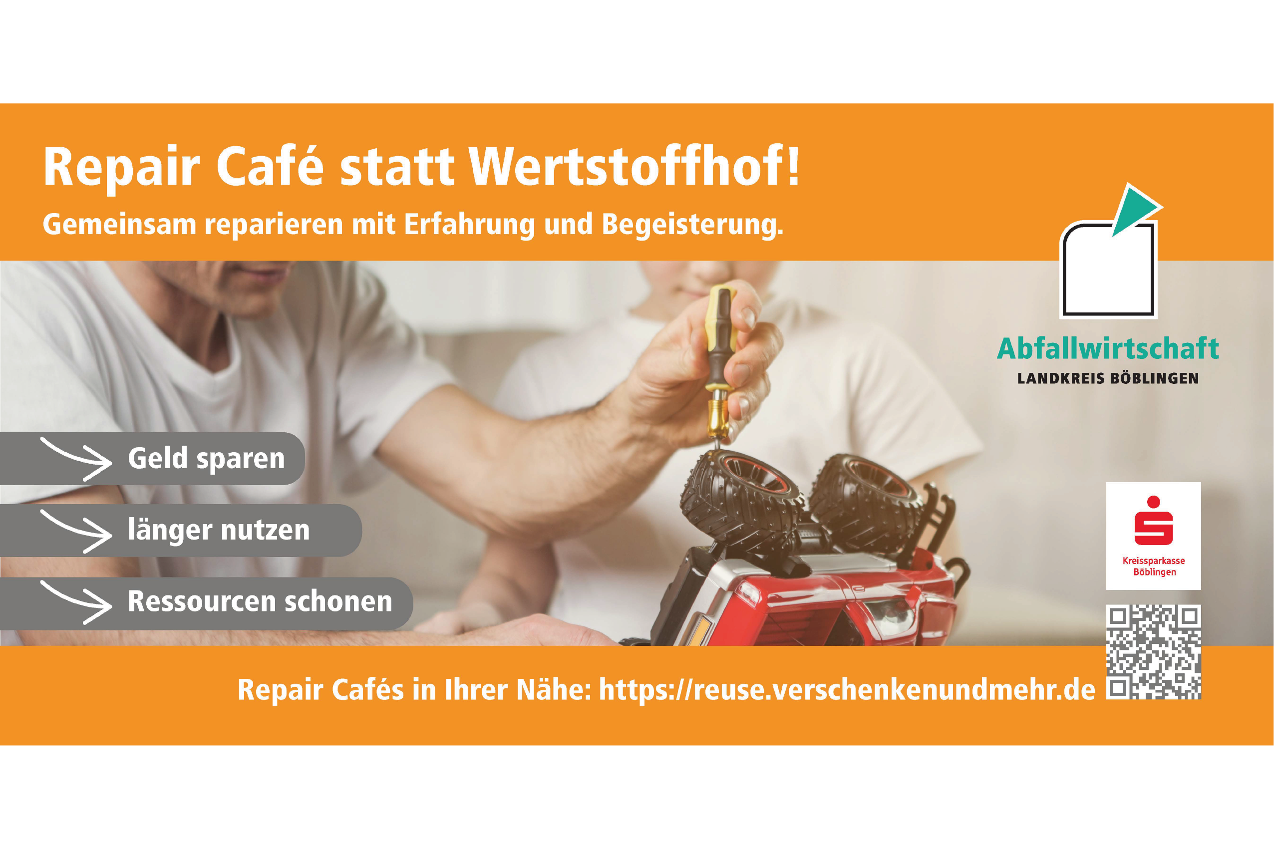 Des Weiteren wird es eine Werbeaktion für die im Landkreis Böblingen angesiedelten Repair Cafés geben, die der AWB in Kürze im Einfahrtsbereich seiner 31 Wertstoffhöfe platzieren wird. Unter dem Titel „Repair Café statt Wertstoffhof! Gemeinsam reparieren mit Erfahrung und Begeisterung“ sollen die Wertstoffhofbesucher auf Reparaturmöglichkeiten aufmerksam gemacht werden. Ziel ist, dem nächsten kaputten Spielzeug oder Staubsauger den Wertstoffhof und damit die „Endstation“ zu ersparen. Den Reparatur-Initiativen werden die Druckdaten dieses einheitlichen Bannermotivs mit der Möglichkeit der Individualisierung für eigene Werbezwecke mit Logo zur Verfügung gestellt.