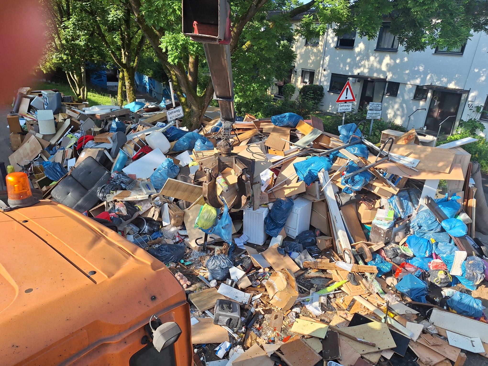 13 Mitarbeiter des AWB haben an zwei Tagen mit 4 Müllsammelfahrzeugen für Sperrmüll, einem Kran-LKW und zwei Sattelzügen fast 230 Tonnen Abfälle aus den Straßen in den Hochwassergebieten abgefahren.