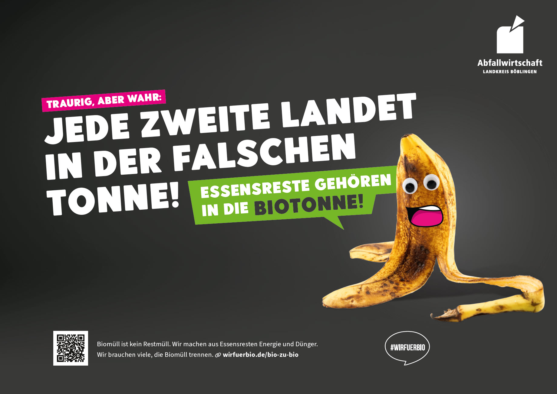 In Deutschland sind Restmülltonnen nach bundesweiter Hausmüllanalyse des Umweltbundesamtes zu durchschnittlich 39 Prozent mit Bioabfall gefüllt. Die Hälfte aller Essensreste, etwa 5,2 Mio. Tonnen Bioabfälle pro Jahr, landen bundesweit in der Restmülltonne. Im Kreis Böblingen zeigt sich ein ähnliches Bild. Landet der Biomüll im Restmüll, gehen wertvolle Ressourcen verloren. Nur der Bioabfall, der in der Biotonne landet, wird zu Energie und Kompost. Jetzt startet der Abfallwirtschaftsbetrieb (AWB) eine Info-Kampagne.