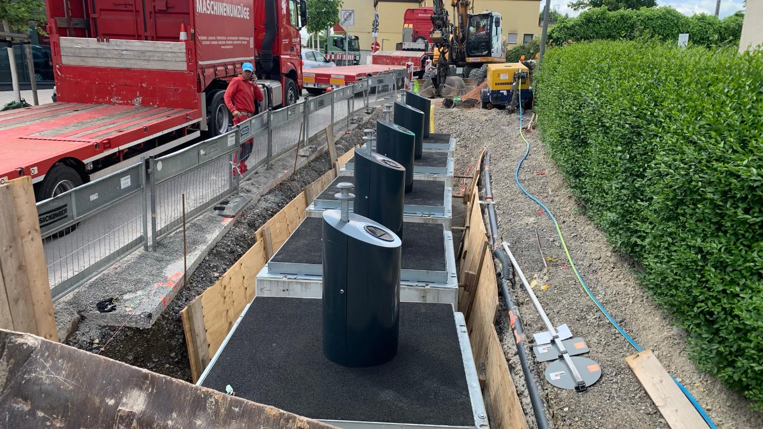 Insgesamt vier Glascontainer und ein Dosencontainer wurden unter der Straßenfläche eingebaut. Sie sind wasserdicht und mit einem Füllvolumen von ca. drei Kubikmetern auch etwas geräumiger als die oberirischen Standardcontainer mit 2,6 Kubikmetern. Es ist geplant, nach einer Testphase die Unterflurbehälter mit einer Sensorik zur Füllstandsmessung auszustatten. Insgesamt eine recht kostspielige Baumaßnahme, wie Baubürgermeister Klaus Brenner aus der Leonberger Stadtverwaltung weiß: „Wir haben rund 80.000 Euro in die Tiefbaumaßnahmen investiert, der Abfallwirtschaftsbetrieb trägt die Kosten für die Behälter und den Einbau in Höhe von circa 20.000 Euro und wir sind nun gespannt, wie sich das Pilotprojekt entwickelt. Es ist auf jeden Fall eine saubere Sache und damit eine deutliche Aufwertung des Straßenbildes. Die Anwohner werden die Sammlung „unter Flur“ sicherlich schnell zu schätzen wissen. Wenn sich das Pilotprojekt bewährt, werden wir den Einsatz von Unterflurbehältern auch noch an weiteren Standorten im Stadtgebiet prüfen.“