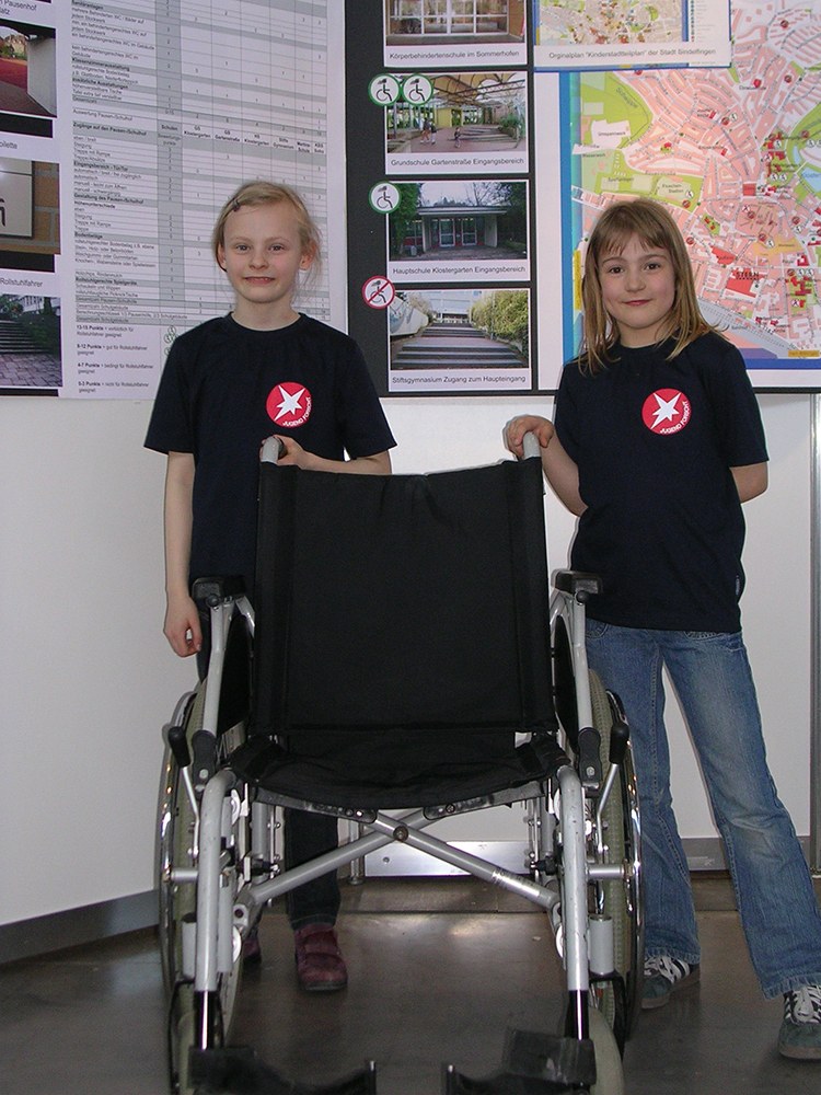 Die beiden Schülerinnen der Grundschule Klostergarten, Kim Bödi und Lara Hönn haben im Schuljahr 2010/ 2011 im Rahmen von "Jugend forscht" die Schulen, Schulhöfe und einige Spielplätze in der Innenstadt unter einem speziellen Blickwinkel erforscht: Sie haben untersucht, wie Kinder, die mit dem Rollstuhl unterwegs sind, in der Sindelfinger Innenstadt voran kommen und mit welchen Schwierigkeiten sie zu kämpfen haben. Ihre Ergebnisse haben sie ebenfalls im Kinderstadtteilplan eingetragen.