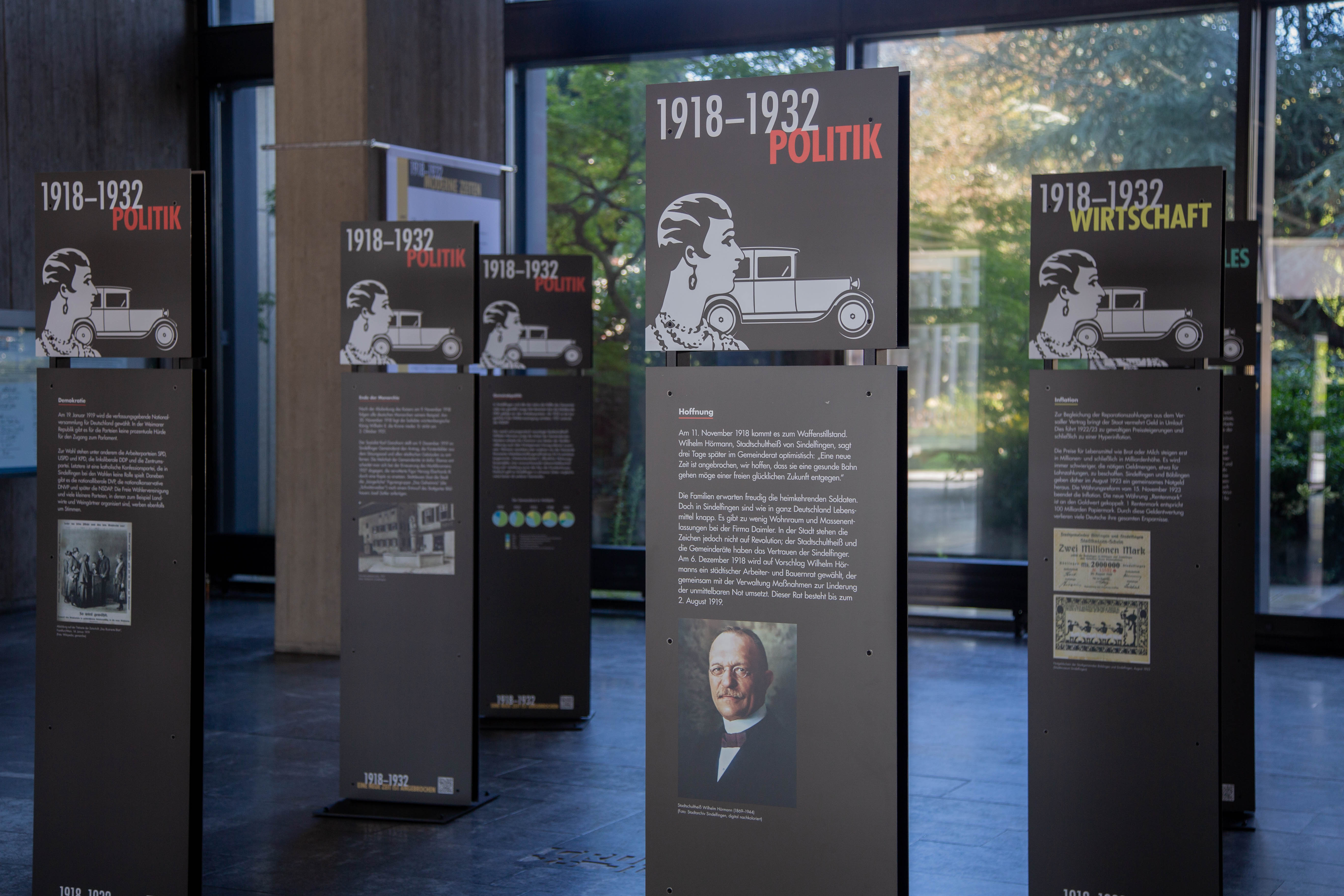 Die Ausstellung beleuchtet die Zeitspanne vom Kriegsende 1918 bis zum Ende der Amtszeit von Wilhelm Hörmann im Juni 1932. Die Ereignisse dieser turbulenten Jahre treiben die Entwicklung Sindelfingens entscheidend voran und stellen Weichen für die Zukunft.
