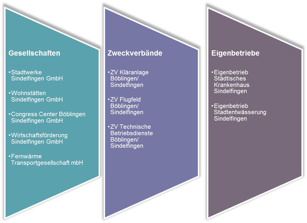 Die Stadt Sindelfingen hat einen Teil ihrer Aufgaben auf eigenständige Unternehmen, Eigenbetriebe und Zweckverbände übertragen, an denen sie als Gesellschafterin entweder allein oder mit anderen beteiligt ist.