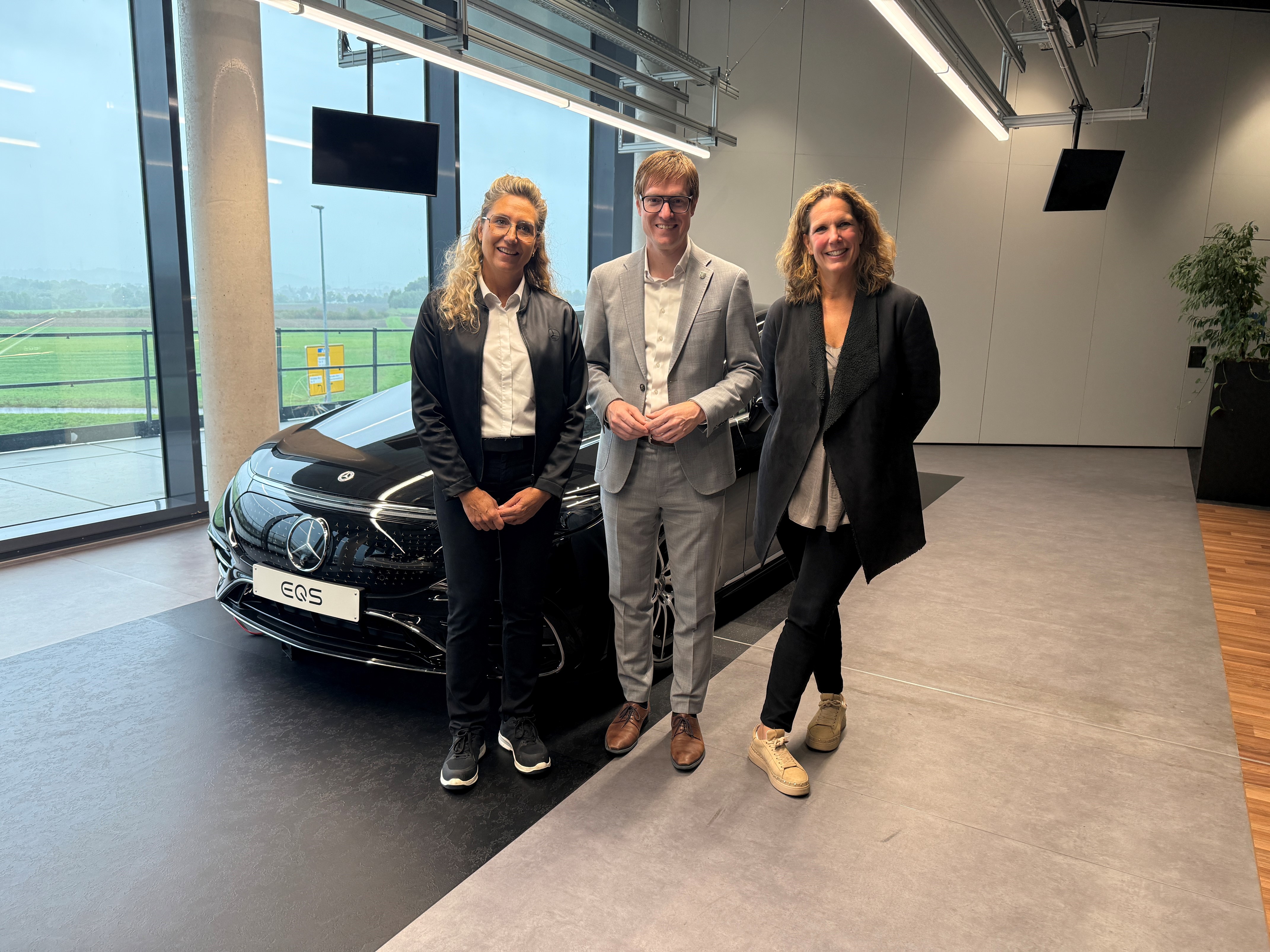 v.l.n.r. Sara Gielen, Leiterin der Produktion und Standortverantwortliche Mercedes-Benz Sindelfingen; Oberbürgermeister Markus Kleemann; Marina Krets, Director Political Operations der Mercedes-Benz Group AG (Stadt Sindelfingen)