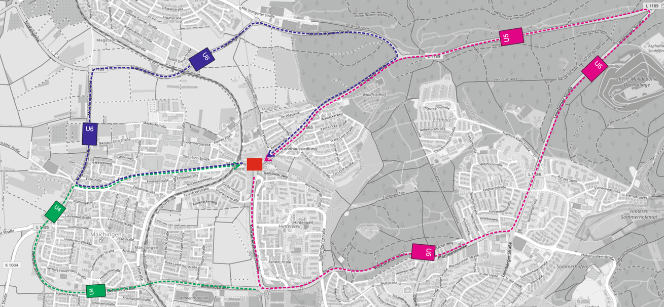Vom Allmendäcker kommend in Richtung Maichingen Nord: Der Verkehr wird über die U4 umgeleitet. Die Strecke verläuft über die Berliner Straße, Darmsheimer Straße, Brunnenstraße und Stuttgarter Straße nach Maichingen Nord.
