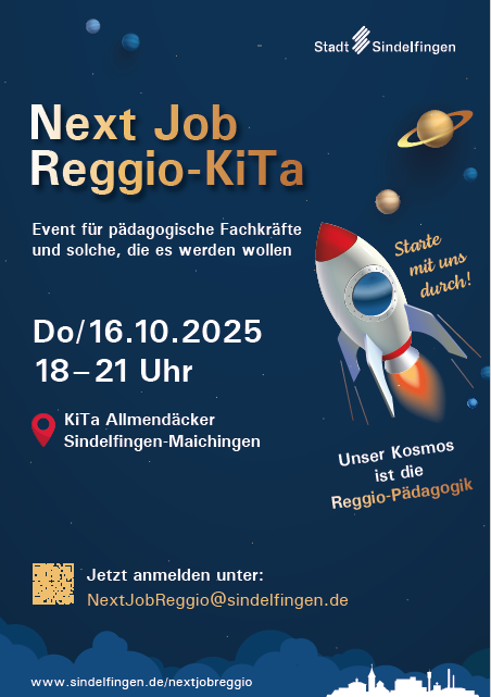 Bei der „Next Job Reggio-KiTa“ ist einiges geboten: Nach einer Begrüßung durch Oberbürgermeister Markus Kleemann besteht die Möglichkeit, die Einrichtung bei einem Rundgang kennenzulernen, mit dem pädagogischen Personal vor Ort ins Gespräch zu kommen und sich direkt mit Vertreterinnen und Vertretern der städtischen Personalabteilung auszutauschen. Darüber hinaus gibt es Workshops zum Thema Reggio-Pädagogik, ein Angebot für kostenlose Bewerbungsfotos, Informationen zur Sindelfinger KiTa-Landschaft, Fingerfood und Give-aways. Auch für das leibliche Wohl der Interessierten ist gesorgt. Das Event beginnt um 18 Uhr in der KiTa Allmendäcker in Maichingen, die bequem mit der S-Bahn-Station (Haltestelle: Sindelfingen Maichingen) oder dem Auto erreichbar ist.