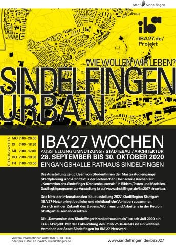 Ort: Eingangshalle Rathaus SindelfingenZeit: 28.09. bis 30.10.2020Montag 7:00 - 20.00 UhrDienstag / Donnerstag 7:00- 18.30 UhrMittwoch 7:00- 17.00 UhrFreitag 7:00 - 13.00 Uhr Das Stadtplanungsamt Sindelfingen zeigt eine Ausstellung zur „Konversion des Sindelfinger Krankenhausareals“, eines von zwei IBA-Projekten der Stadt Sindelfingen. Die Ausstellung in der Eingangshalle des Rathauses Sindelfingen zeigt Ideen von StudentInnen des Masterstudienganges Städtebau der Technischen Hochschule Aachen.Zu sehen sind die ersten Bilder und Modelle zu diesem großen städtebaulichen Projekt der Stadt Sindelfingen im Rahmen der IBA StadtRegion Stuttgart 2027.