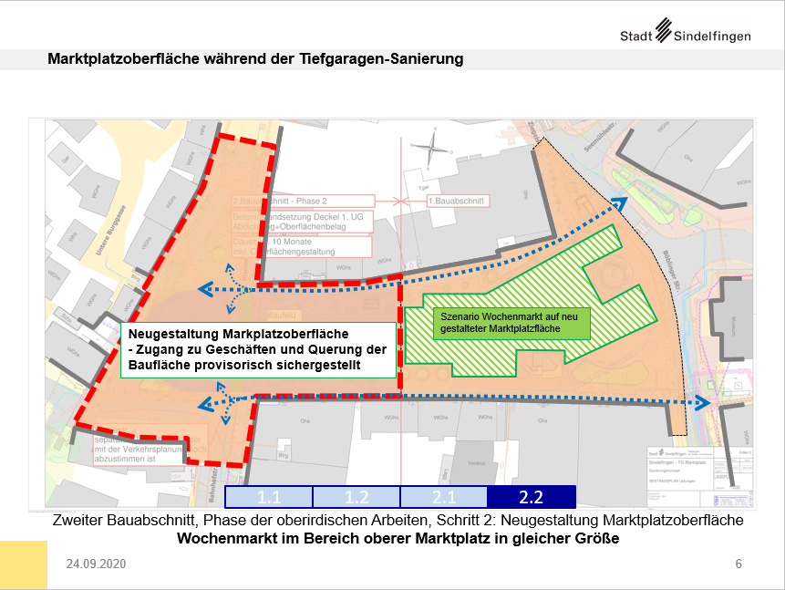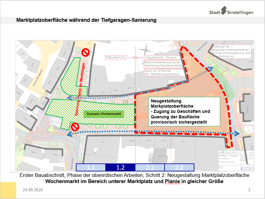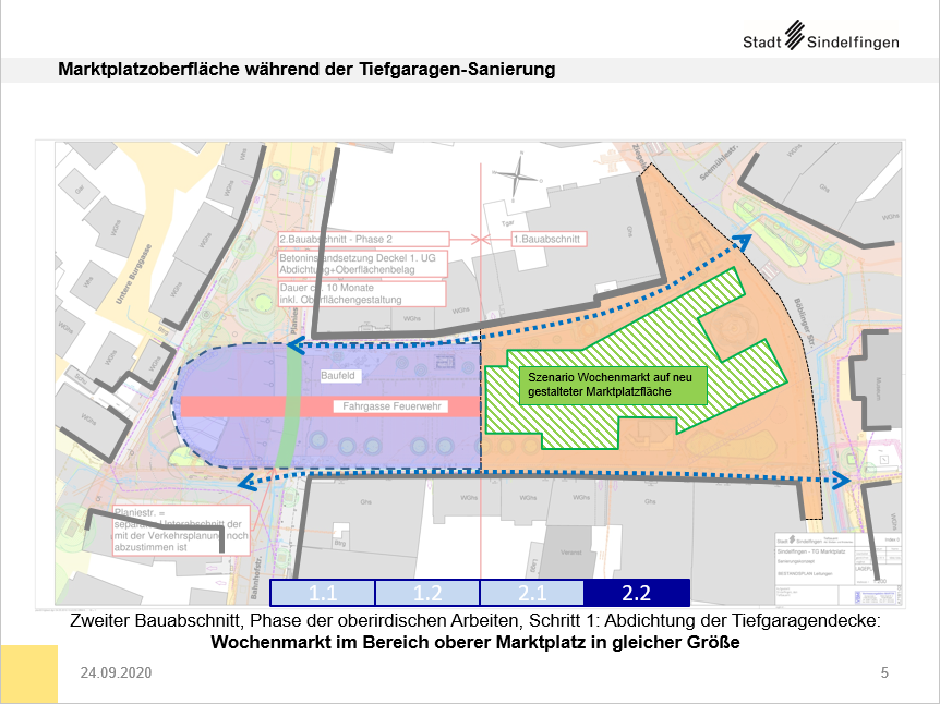 Sein neues Gesicht erhält der Marktplatz parallel zur künftig anstehenden Tiefgaragensanierung. Der Wochenmarkt kann dabei, mit zwischenzeitlicher Verlagerung auf den oberen bzw. unteren Bereich, auf dem Marktplatz verbleiben: Die Planungen sehen eine Tiefgaragensanierung in zwei aufeinanderfolgende Bauabschnitte vor – daran orientiert wird auch die neue Marktplatzoberfläche zeitversetzt in zwei Abschnitten hergestellt.