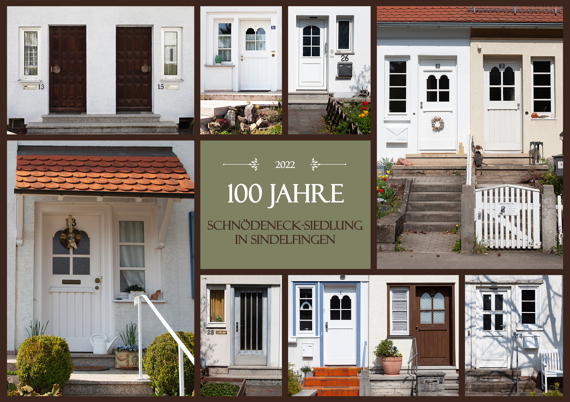 Anlässlich des 100jährigen Jubiläums der denkmalgeschützten Gartenstadtsiedlung "Schnödeneck" ist dieses Plakat entstanden. Darauf zu sehen sind die charakteristisch angeordneten Türen und Seitenfenster der Sindelfinger Schnödenecksiedlung - von ihren BewohnerInnen liebevoll gestaltet.