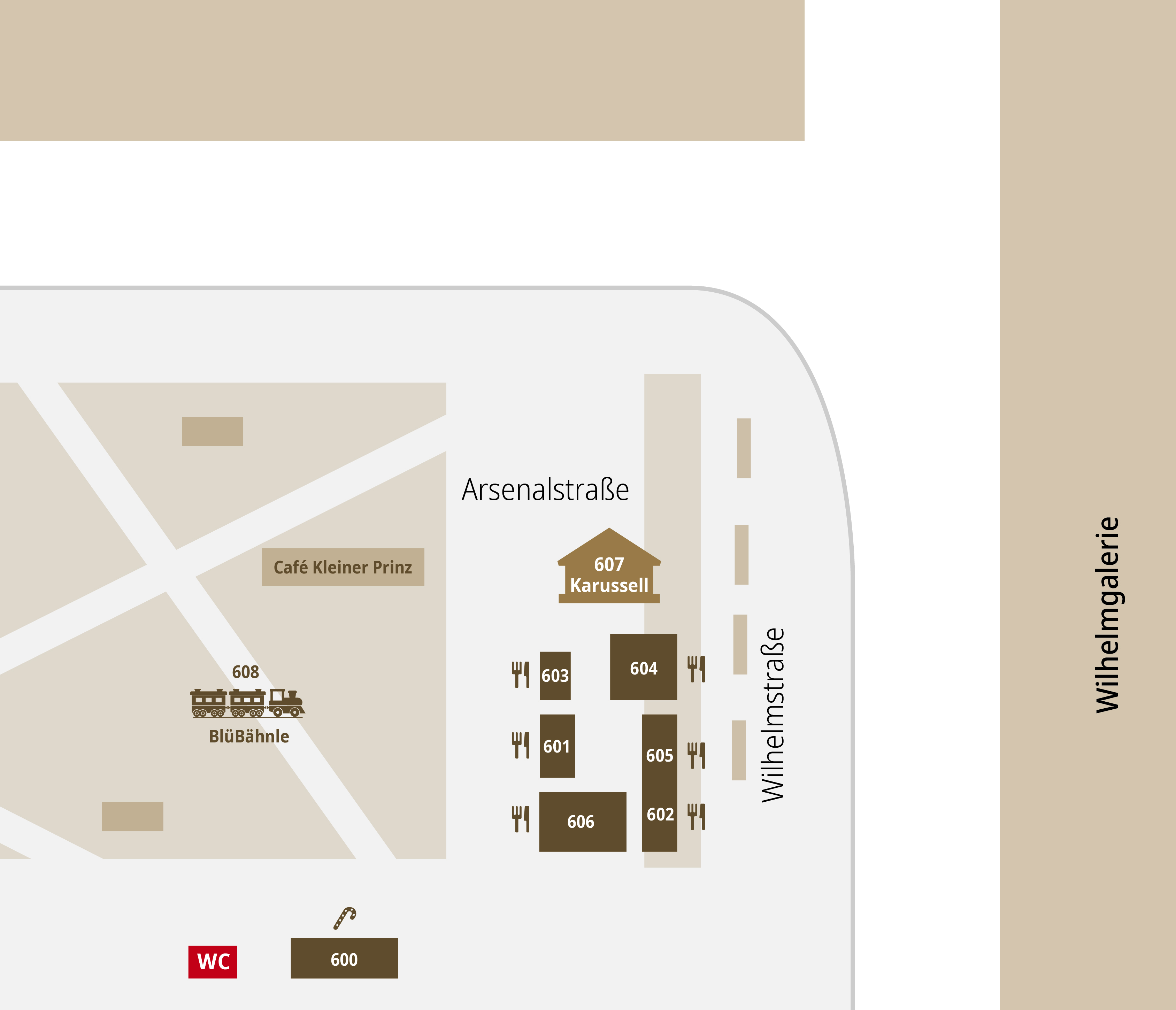 Der Weihnachtszauber wurde ausgeweitet auf den Arsenalplatz – mit weiteren stimmungsvollen Ständen und neuen Highlights zum Entdecken und Genießen. Auch für unsere kleinen Besucher gibt es auf dem Arsenalplatz besondere Highlights zu entdecken: Hier drehen ein Karussell und das beliebte Blübähnle ihre Runden und sorgen für leuchtende Kinderaugen und jede Menge Spaß.