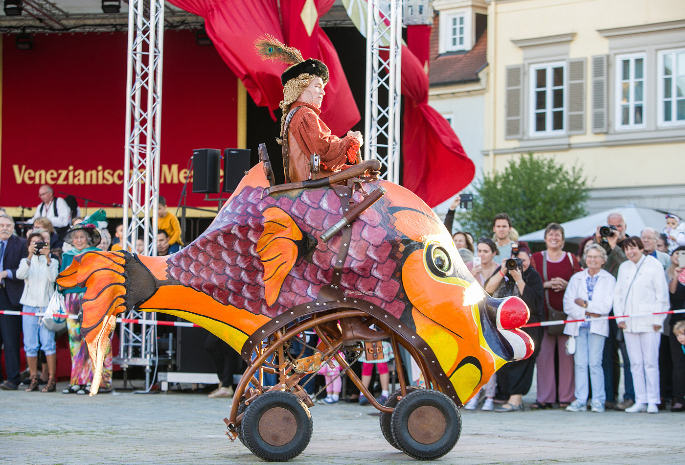Ein absolutes Highlight der Venezianischen Messe ist die Künstlerprozession zum Marktplatz. Sie bildet den Auftakt zur Venezianischen Messe und läutet somit das bunte Treiben ein. Über 2.000 Gäste in Kostüm und Maske verleihen der Venezianischen Messe ihren ganz besonderen Charme und präsentieren ihre extravaganten und spektakulären Kostüme bei Kostümdefilées über den eigens angefertigten Gondelsteg - echtes Venedig-Feeling, das ihr euch nicht entgehen lassen solltet!